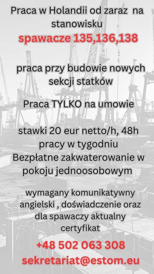 wymagany komunikatywny angielski, doświadczenie oraz dla spawaczy aktualny certyfikat