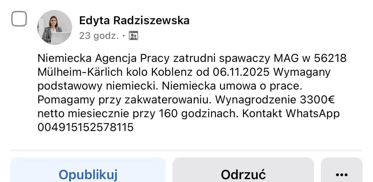 Niemiecka Agencja Pracy zatrudni spawaczy MAG w 56218 Mülheim-Kärlich kolo Koblenz od 06.11.2025 Wymagany podstawowy niemiecki. Niemiecka umowa o prace. Pomagamy przy zakwaterowaniu. Wynagrodzenie 3300€ netto miesiecznie przy 160 godzinach. Kontakt WhatsApp 004915152578115