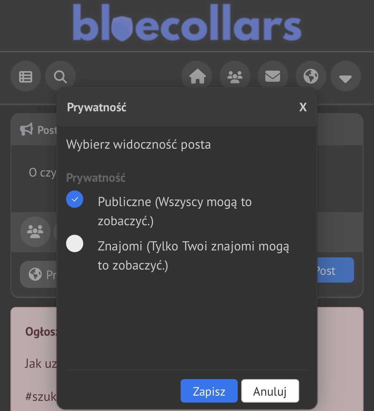 Wybór prywatności to jedno z najważniejszych narzędzi bluecollars. Logika działania jest taka, że ustawienie posta jako publiczny - jest jednocześnie zgodą RODO na publikację - czyli wszyscy zobaczą treść, google ją zindexuje a admin może promować posta na facebooku - czyli domyślny tryb pracy serwisu.
