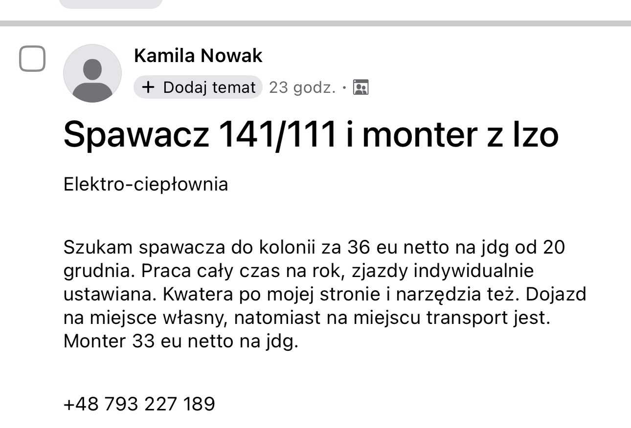 Szukam spawacza do kolonii za 36 eu netto na jdg od 20 grudnia. Praca cały czas na rok, zjazdy indywidualnie ustawiana. Kwatera po mojej stronie i narzędzia też. Dojazd na miejsce własny, natomiast na miejscu transport jest. Monter 33 eu netto na jdg.