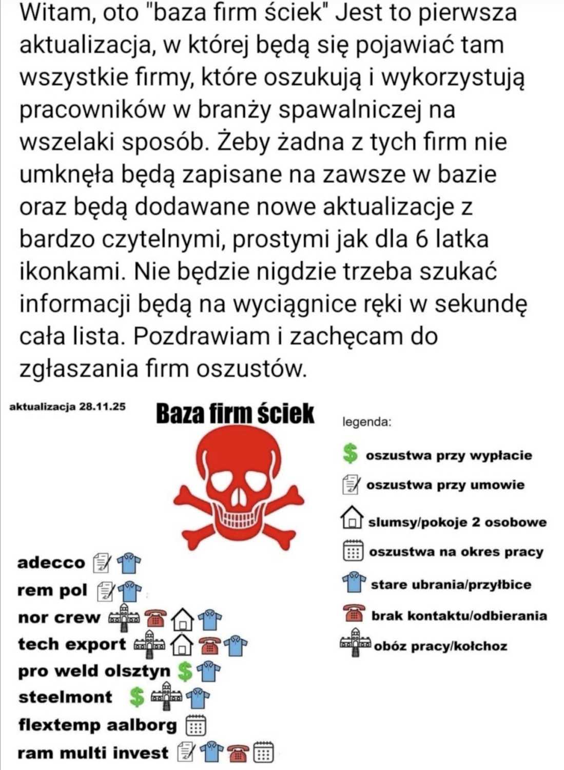 #ostrzezenie Witam, oto "baza firm 艣ciek" Jest to pierwsza aktualizacja, w kt贸rej b臋d膮 si臋 pojawia膰 tam wszystkie firmy, kt贸re oszukuj膮 i wykorzystuj膮 pracownik贸w w bran偶y spawalniczej na wszelaki spos贸b. 呕eby 偶adna z tych firm nie umkn臋艂a b臋d膮 zapisane na zawsze w bazie oraz b臋d膮 dodawane nowe aktualizacje z bardzo czytelnymi, prostymi jak dla 6 latka ikonkami. Nie b臋dzie nigdzie trzeba szuka膰 informacji b臋d膮 na wyci膮gnice r臋ki w sekund臋 ca艂a lista. Pozdrawiam i zach臋cam do zg艂aszania firm oszust贸w.