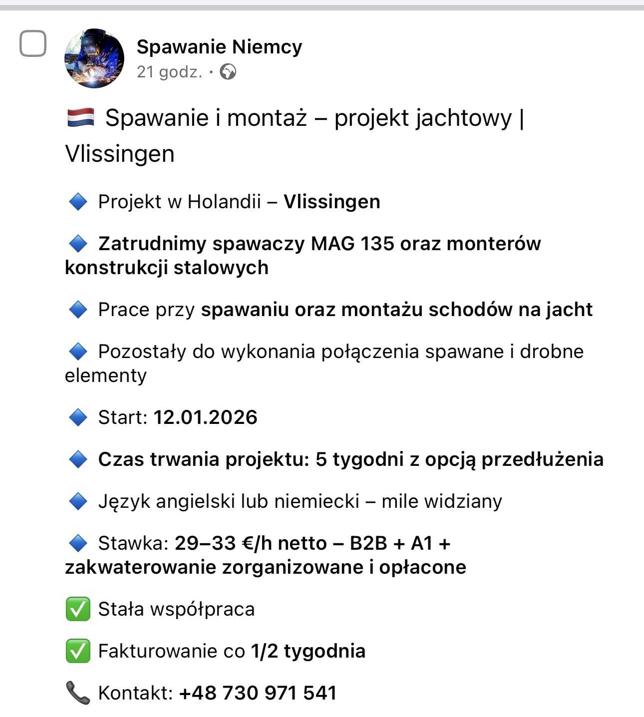 🔹 Stawka: 29–33 €/h netto – B2B + A1 + zakwaterowanie zorganizowane i opÅ‚acone