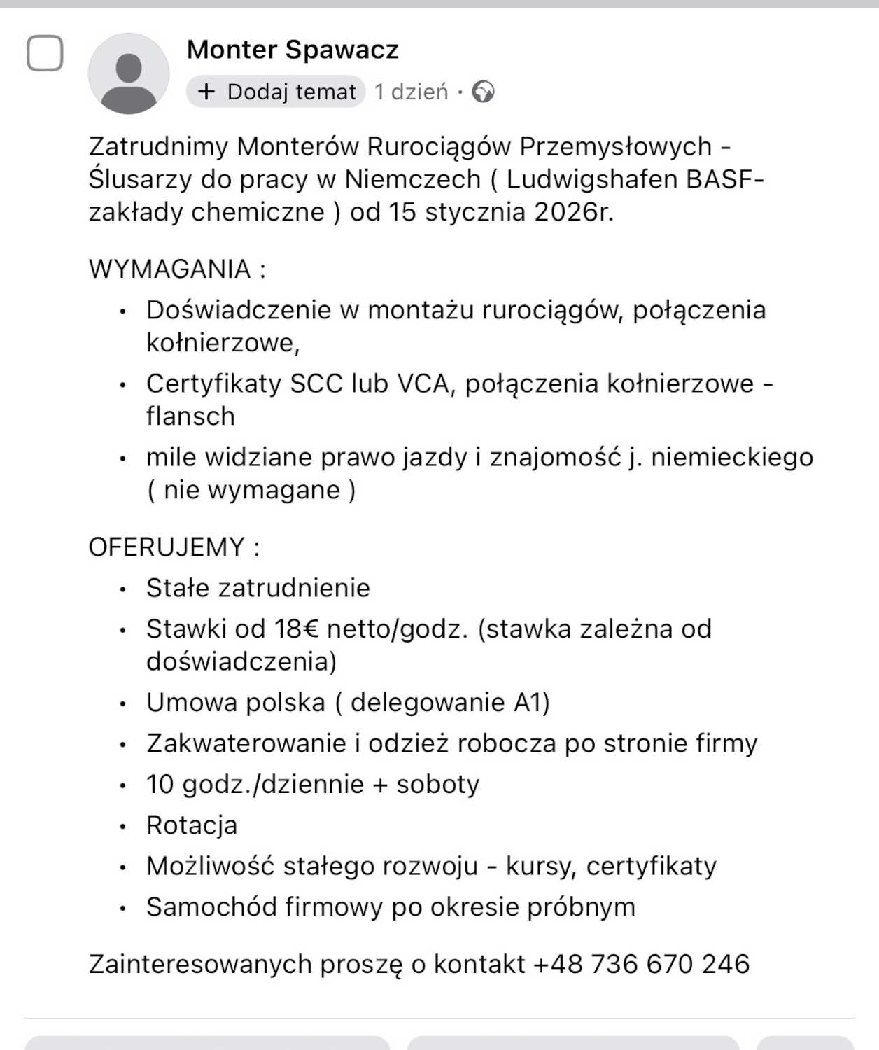 Zainteresowanych proszÄ™ o kontakt +48 736 670 246