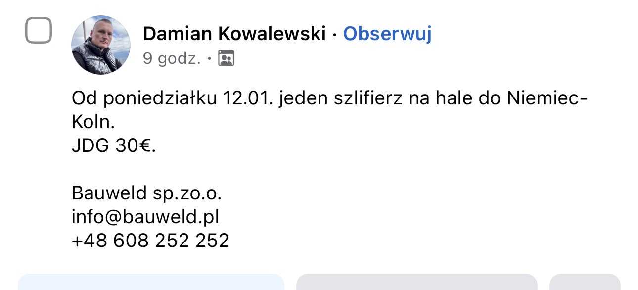 #pomocnik #niemcy Od poniedziałku 12.01. jeden szlifierz na hale do Niemiec-Koln. JDG 30€. Bauweld sp.zo.o. info@bauweld.pl +48 608 252 252