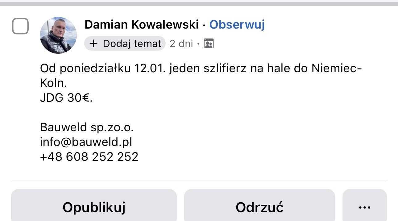#pomocnik #niemcy Od poniedziałku 12.01. jeden szlifierz na hale do Niemiec-Koln. JDG 30€. Bauweld sp.zo.o. info@bauweld.pl +48 608 252 252