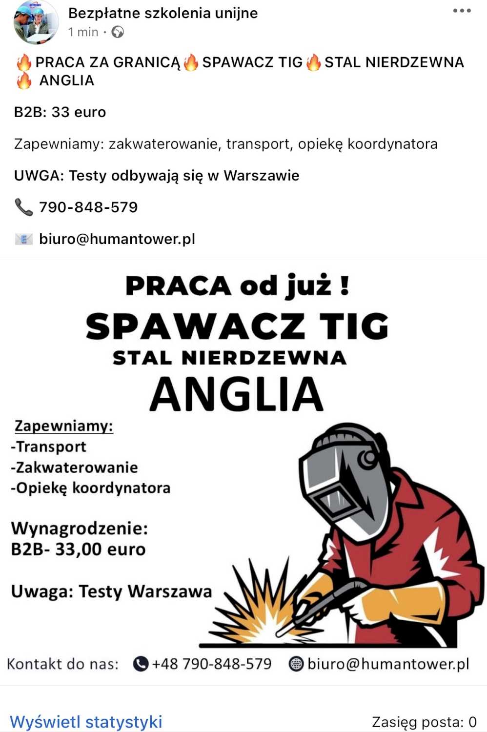 #uk #tig 🔥PRACA ZA GRANICÄ„🔥SPAWACZ TIG🔥STAL NIERDZEWNA🔥 ANGLIA B2B: 33 euro Zapewniamy: zakwaterowanie, transport, opiekÄ™ koordynatora UWGA: Testy odbywajÄ… siÄ™ w Warszawie 📞 790-848-579 📧 biuro@humantower.pl