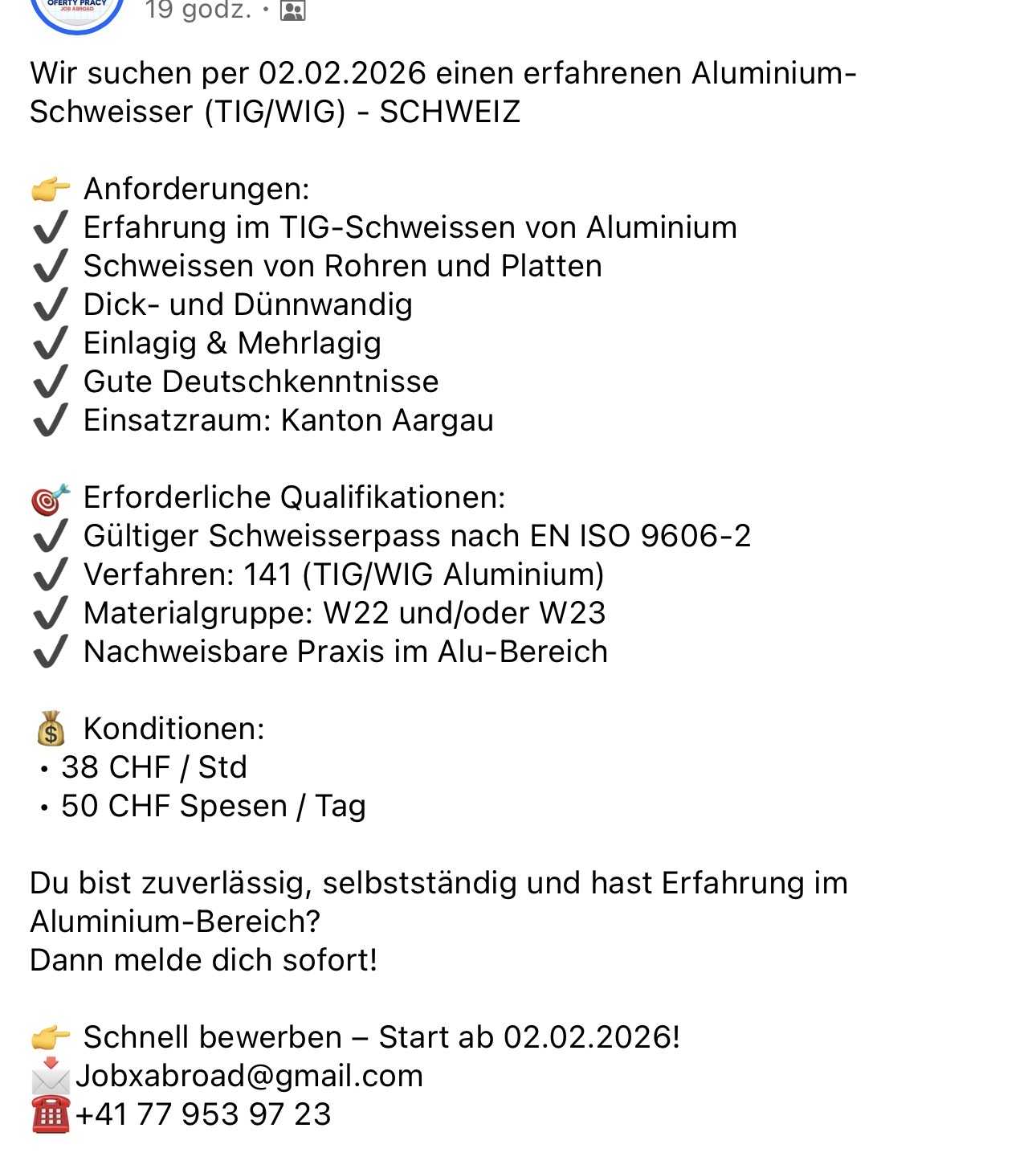 Wir suchen per 02.02.2026 einen erfahrenen Aluminium-Schweisser (TIG/WIG) - SCHWEIZ