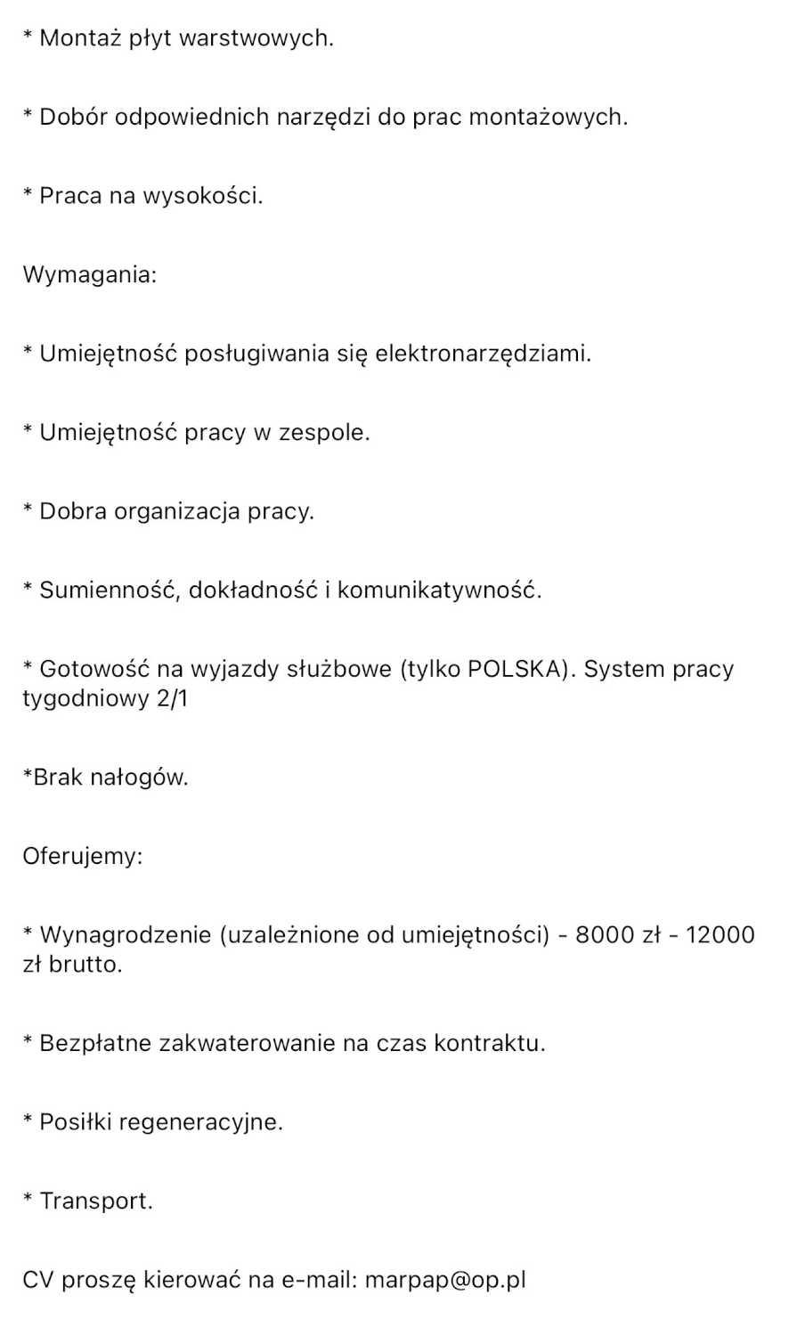 CV prosz臋 kierowa膰 na e-mail: marpap@op.pl