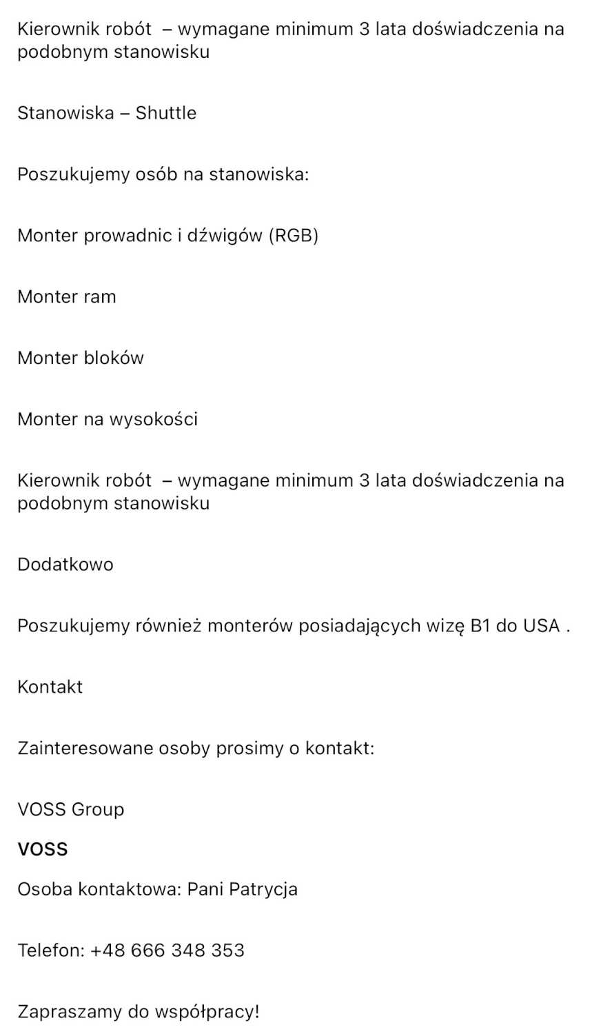 Poszukujemy również monterów posiadających wizę B1 do USA .