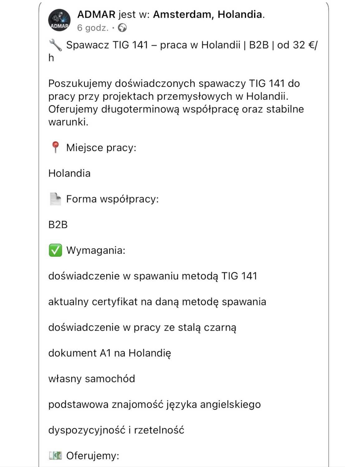 🔧 Spawacz TIG 141 – praca w Holandii | B2B | od 32 €/h