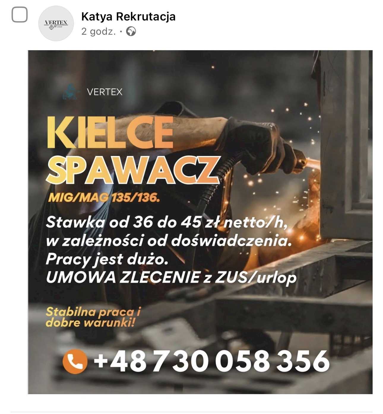 #polska #kielce #mag VERTEX KIELCE SPAWACZ MIG/MAG 135/136. Stawka od 36 do 45 zł netto/h, w zależności od doświadczenia. Pracy jest dużo. UMOWA ZLECENIE z ZUS/urlop Stabilna praca i dobre warunki! • +48 730 058 356