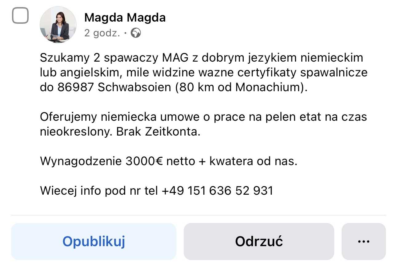 Szukamy 2 spawaczy MAG z dobrym jezykiem niemieckim lub angielskim, mile widzine wazne certyfikaty spawalnicze do 86987 Schwabsoien (80 km od Monachium).