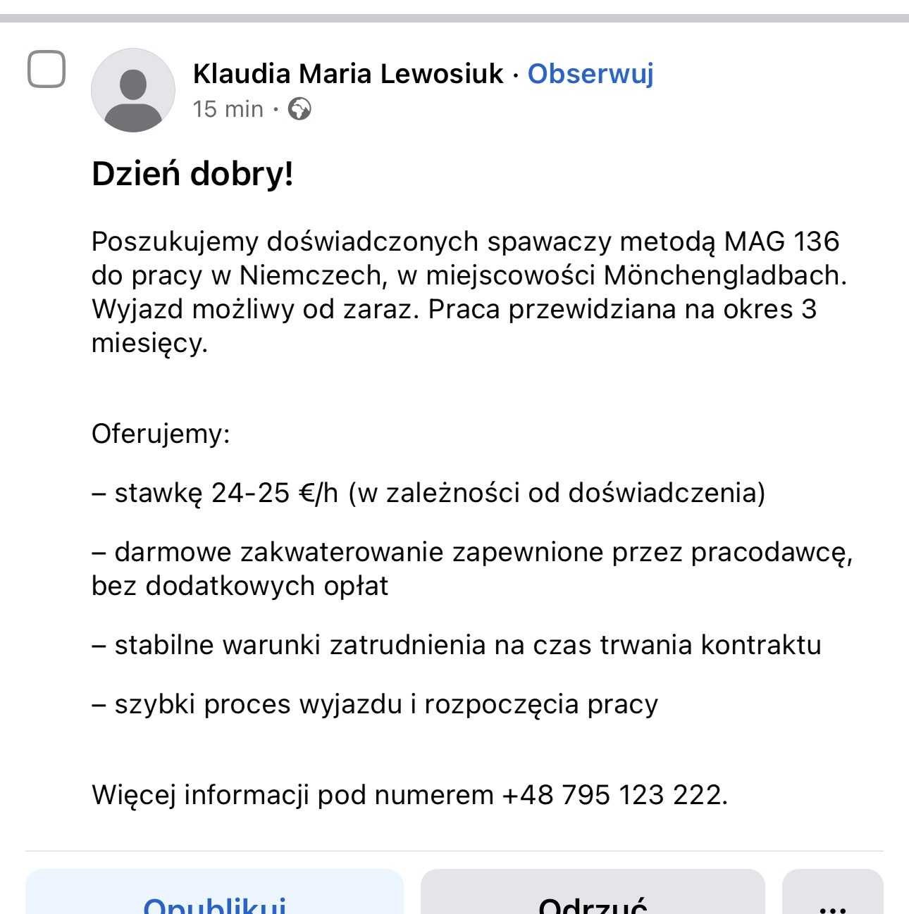 Poszukujemy doświadczonych spawaczy metodą MAG 136 do pracy w Niemczech, w miejscowości Mönchengladbach. Wyjazd możliwy od zaraz. Praca przewidziana na okres 3 miesięcy.