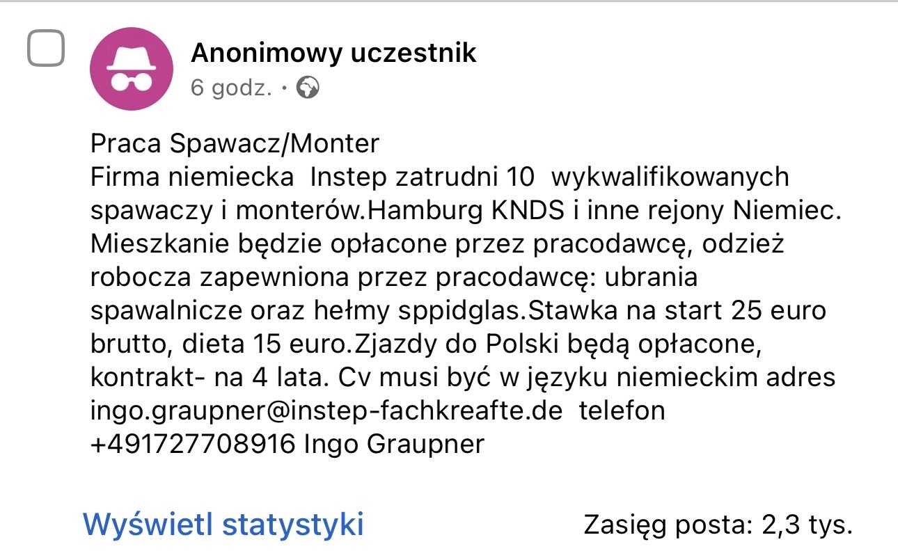 Firma niemiecka Instep zatrudni 10 wykwalifikowanych spawaczy i monterów.Hamburg KNDS i inne rejony Niemiec. Mieszkanie będzie opłacone przez pracodawcę, odzież robocza zapewniona przez pracodawcę: ubrania spawalnicze oraz hełmy sppidglas.Stawka na start 25 euro brutto, dieta 15 euro.Zjazdy do Polski będą opłacone, kontrakt- na 4 lata. Cv musi być w języku niemieckim adres ingo.graupner@instep-fachkreafte.de telefon +491727708916 Ingo Graupner