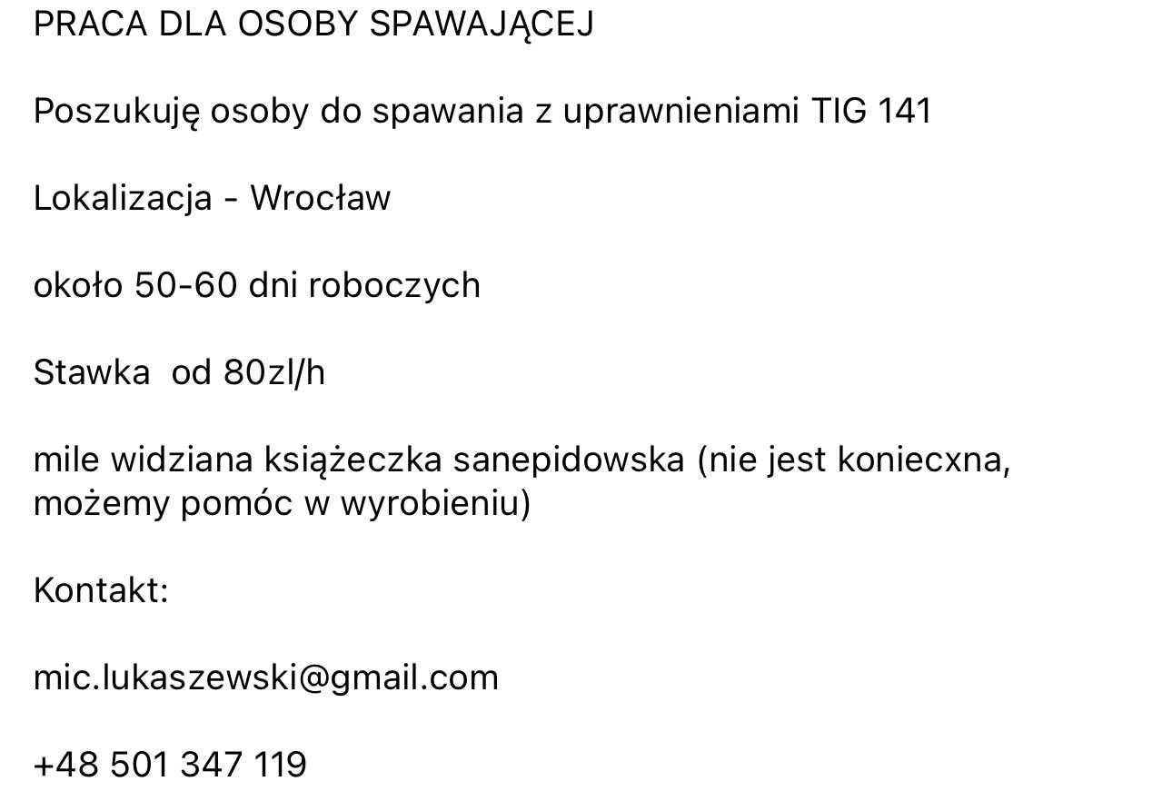 Poszukuję osoby do spawania z uprawnieniami TIG 141