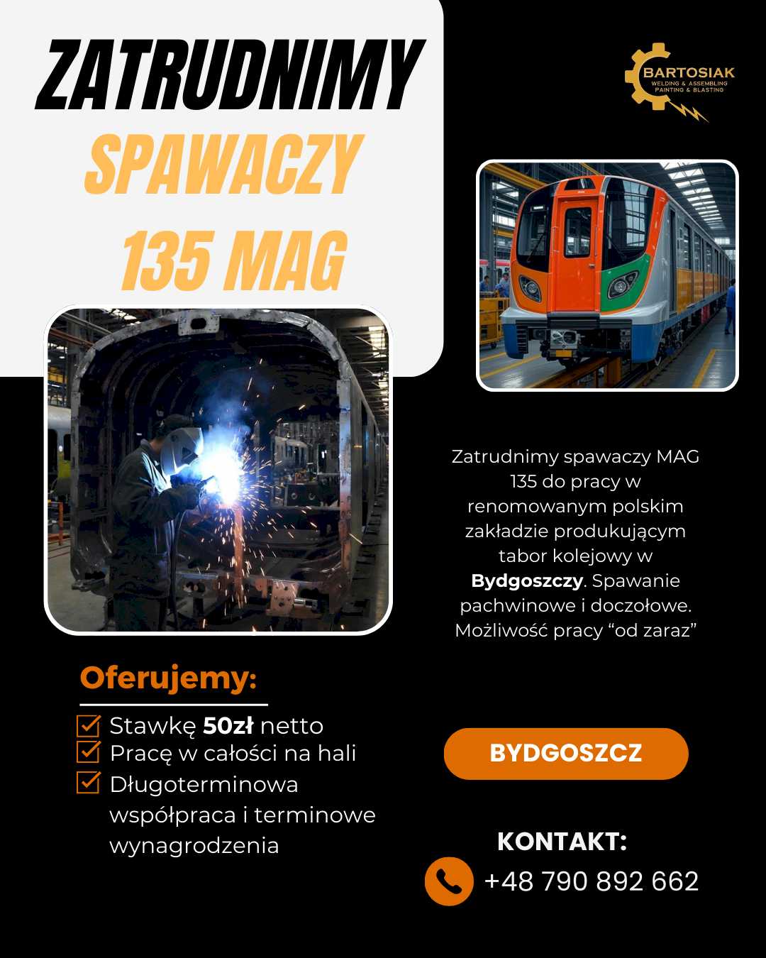 Polski lider w produkcji taboru szynowego z siedzibą w Bydgoszczy rozpoczyna dużą rekrutację, na którą szukamy doświadczonych spawaczy: