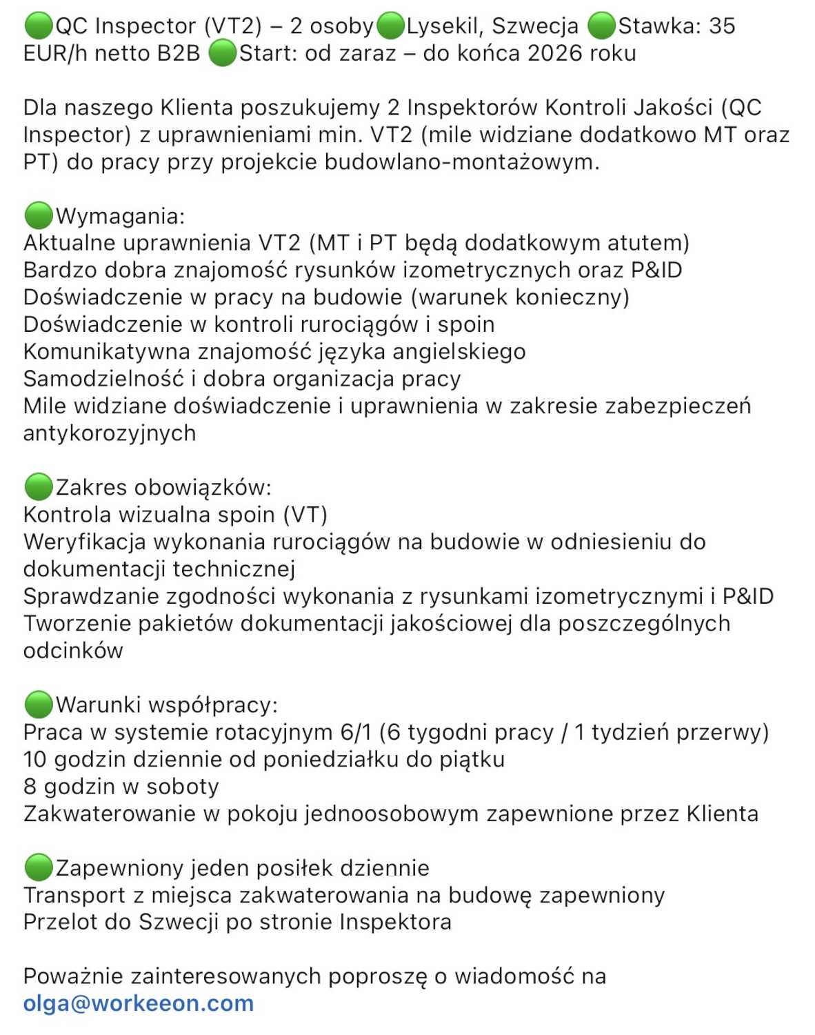 🟢QC Inspector (VT2) – 2 osoby🟢Lysekil, Szwecja 🟢Stawka: 35 EUR/h netto B2B 🟢Start: od zaraz – do końca 2026 roku