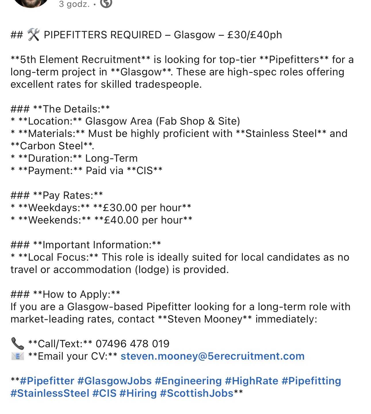 If you are a Glasgow-based Pipefitter looking for a long-term role with market-leading rates, contact **Steven Mooney** immediately: