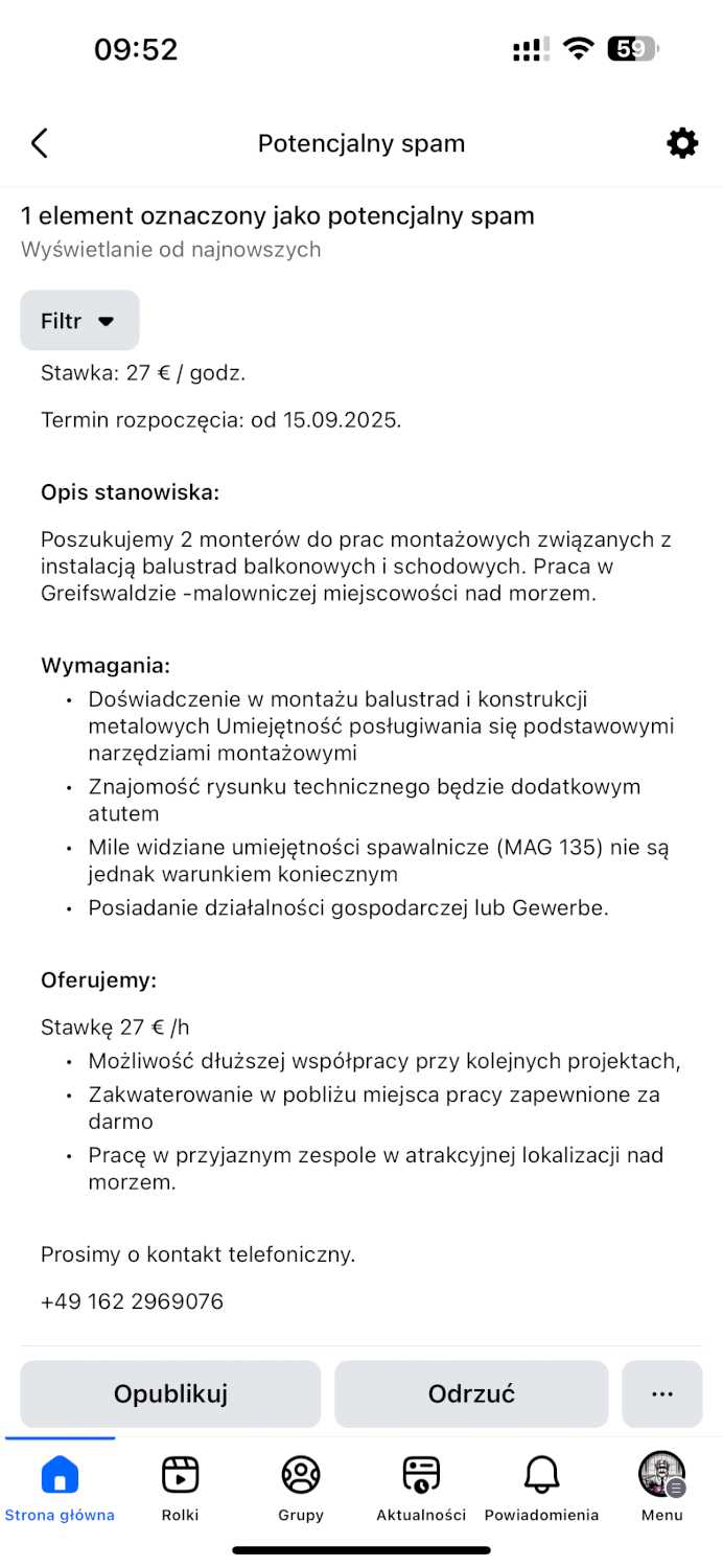 Poszukujemy 2 monterów do prac montażowych związanych z instalacją balustrad balkonowych i schodowych. Praca w Greifswaldzie -malowniczej miejscowości nad morzem.