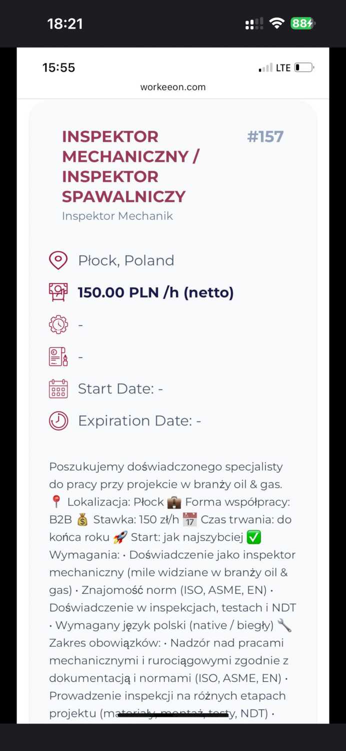 Poszukujemy doświadczonego specjalisty do pracy przy projekcie w branży oil & gas. 📍 Lokalizacja: Płock 💼 Forma współpracy: B2B 💰 Stawka: 150 zł/h 📅 Czas trwania: do końca roku 🚀 Start: jak najszybciej ✅ Wymagania: • Doświadczenie jako inspektor mechaniczny (mile widziane w branży oil & gas) • Znajomość norm (ISO, ASME, EN) • Doświadczenie w inspekcjach, testach i NDT • Wymagany język polski (native / biegły) 🔧 Zakres obowiązków: • Nadzór nad pracami mechanicznymi i rurociągowymi zgodnie z dokumentacją i normami (ISO, ASME, EN) • Prowadzenie inspekcji na różnych etapach projektu (materiały, montaż, testy, NDT) • Weryfikacja testów (ciśnieniowych, funkcjonalnych) oraz jakości wykonania • Identyfikacja niezgodności (NCR) i wsparcie działań korygujących • Monitorowanie postępu prac oraz prowadzenie dokumentacji jakościowej • Współpraca z zespołem projektowym 💼 Oferujemy: • Atrakcyjną stawkę godzinową • Stabilny projekt do końca roku • Możliwość pracy przy wymagającym projekcie • Prosty i szybki proces rekrutacyjny ℹ️ Dodatkowe informacje: • Koszty (dojazd, zakwaterowanie itp.) po stronie inspektora • Posiadamy mieszkania w Płocku – możliwość zapewnienia zakwaterowania lub wsparcia w organizacji (opcja dodatkowo płatna) 🤝 Program poleceń Poleć kandydata i otrzymaj 1000 zł bonusu, jeśli rekomendowana osoba podejmie współpracę 💰 📩 Aplikacja: Wyślij CV lub napisz wiadomość prywatną contact@steelforgeinspection.com hashtag #hiring hashtag #praca hashtag #inspektormechaniczny hashtag #qualitycontrol hashtag #kontrolajakosci hashtag #NDT hashtag #oilandgas hashtag #rafineria hashtag #B2B hashtag #przemysł hashtag #energetyka hashtag #rekrutacja hashtag #ofertapracy hashtag #Płock hashtag #jobopportunity hashtag #engineering
