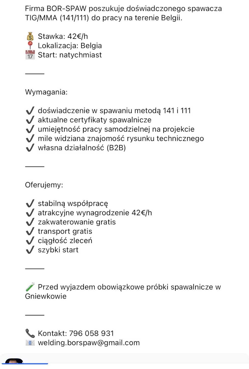 Firma BOR-SPAW poszukuje doświadczonego spawacza TIG/MMA (141/111) do pracy na terenie Belgii.