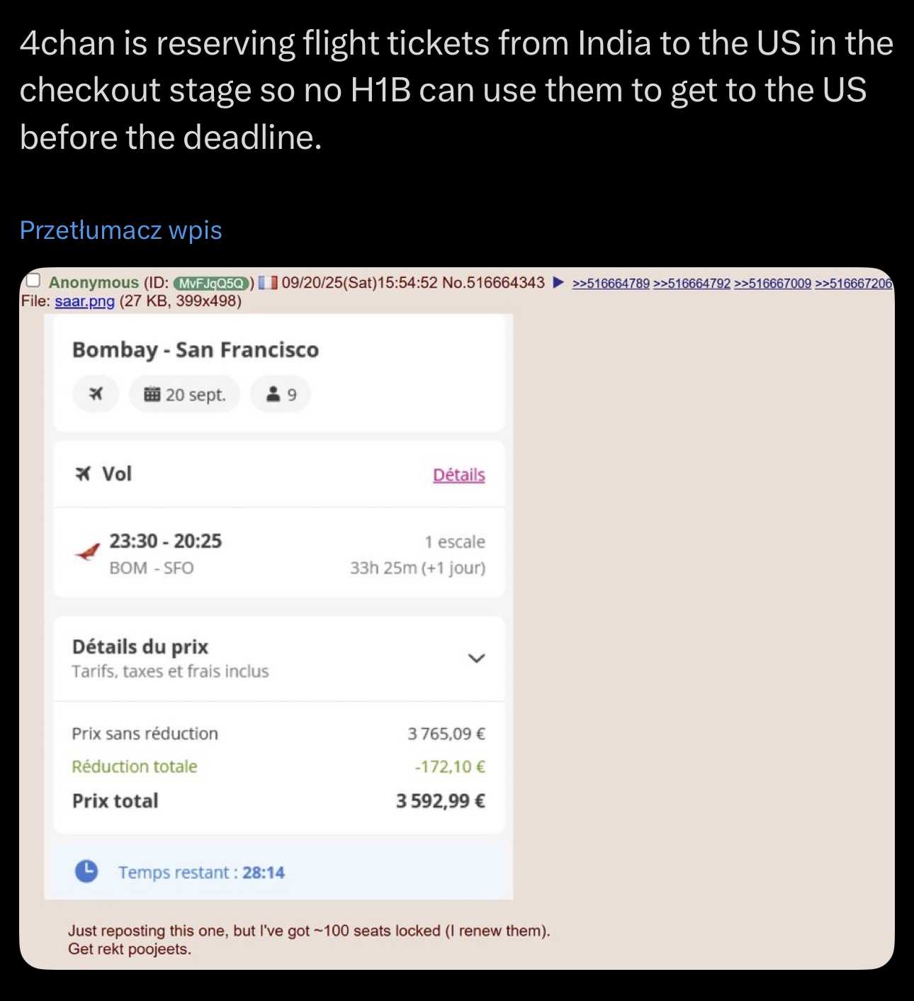 Trump wyda艂 dekret 偶e ka偶da nowa wiza H-1B b臋dzie p艂atna 100 tys. dolar贸w (podobno rocznie). Ale na razie op艂ata nie b臋dzie dotyczy膰 tych zagranicznych pracownik贸w kt贸rzy dnia 21.09.25 b臋d膮 znajdowa膰 si臋 na terenie USA. W zwi膮zku z tym Hindusi pracuj膮cy na sta艂e w US a b臋d膮cy obecnie w Indiach masowo wykupuj膮 loty do USA. Na 4chanie obecnie trwa zorganizowana akcja rezerwacji/wykupywania bilet贸w z Indii do USA (i nie p艂acenia za nie oczywi艣cie. ( 汀掳 蜏蕱 汀掳) ) Cena za bilet z przylotem jutro skoczy艂a ju偶 do kilku tys. dolar贸w a w wielu liniach nie mo偶na ju偶 zarejestrowa膰 miejsca.