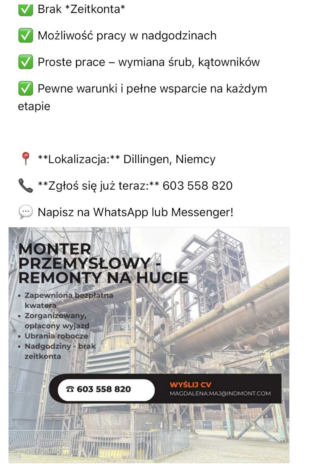🚀 MONTER PRZEMYSŁOWY – prace remontowe w Hucie, Dillingen (Niemcy) 🇩🇪