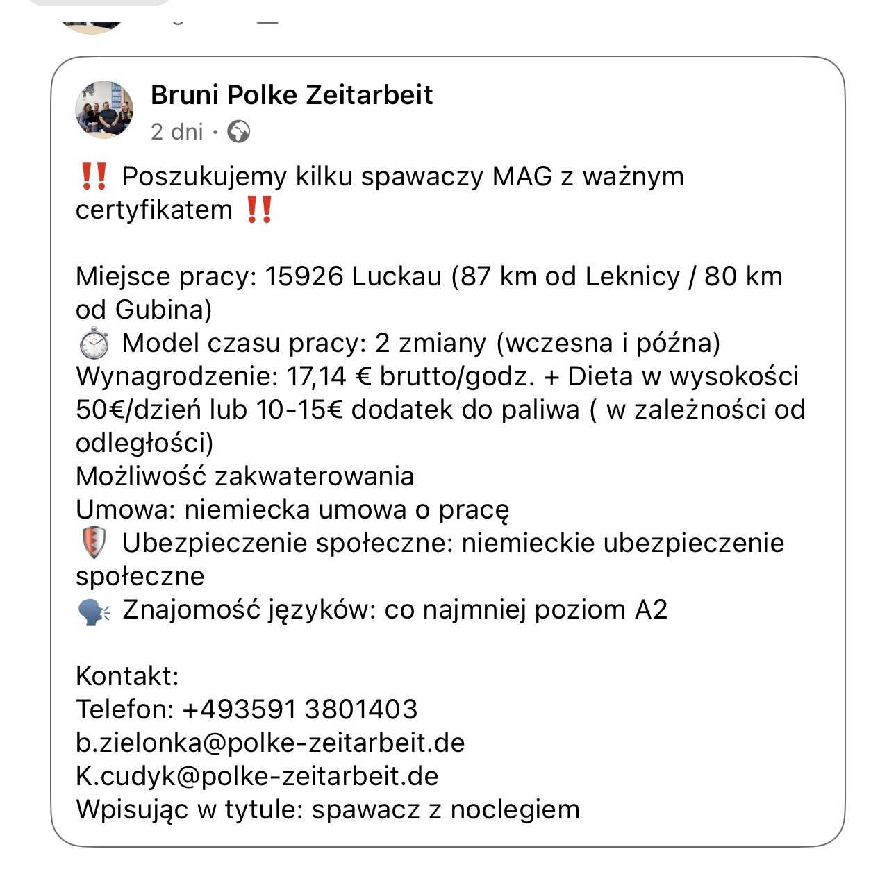 Miejsce pracy: 15926 Luckau (87 km od Leknicy / 80 km od Gubina)