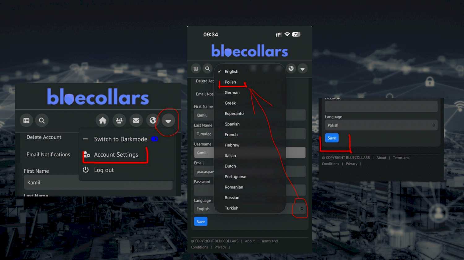 Na screenie macie obrazkową instrukcje jak zmienić język na polski - ci którzy założą konta od dziś na www.bluecollars.eu będą mieli domyślnie ale ci co już mają konta muszą sobie zmienić w ustawieniach profilu.