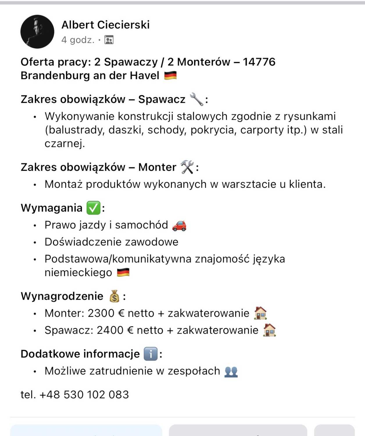 • Spawacz: 2400 € netto + zakwaterowanie 🏠