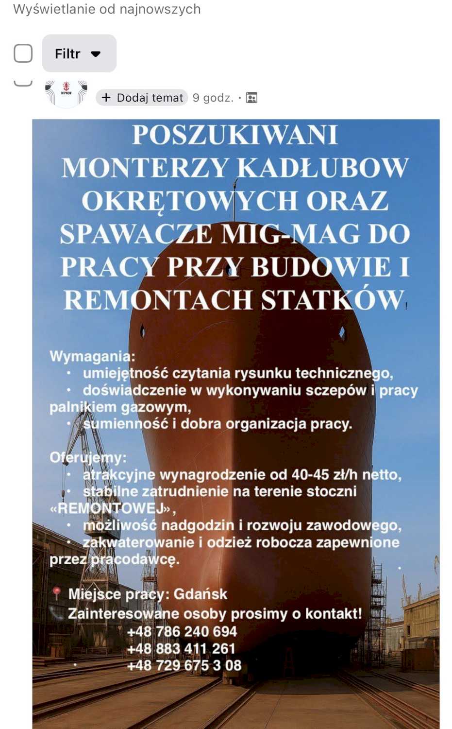 rakcyjne wynagrodzenie od 40-45 zt/h netto, stabilne zatrudnienie na terenie stoczni