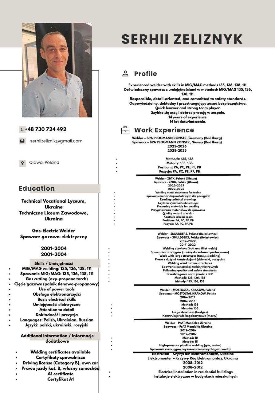 Poszukuję do pary spawacza MIG/MAG chętnego na wspólny wyjazd do Szwajcarii z ważnym certyfikatem który rozmawia po niemiecku.